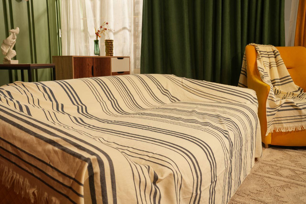 مش مجرد مفرش عادي، ده قطعة مميزة قطن ١٠٠٪ بخامة ناعمة ونسيج بارز تضيف لمسة شيك لبيتك. ألوانه ثابتة، وتصميمه متقن، وينفع لكل الأوقات والمناسبات